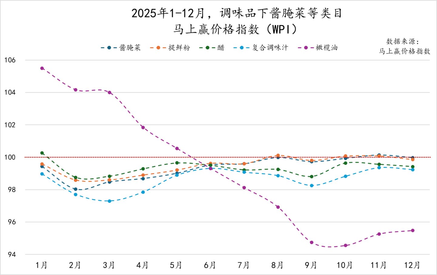 为了更好地分析类目价格的变动与走势,我们拉取了2025年全年分月,调味品类目整体及各重点类目的马上赢价格指数。马上赢价格指数(WPI)以100为基准值,其数值上下波动为类目的价格指数与去年同期价格指数的相对百分比,100表示与去年同月持平,高于100表示同比价格水平上升,低于100则表示同比价格水平下降。